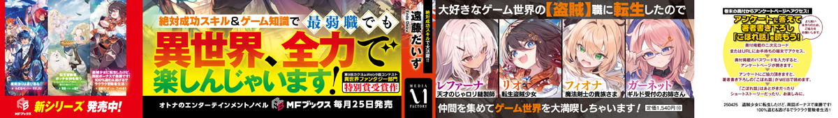MFブックス『盗賊少女に転生したけど、周回ボーナスで楽勝です! 100%盗む&逃げるでラクラク冒険者生活』